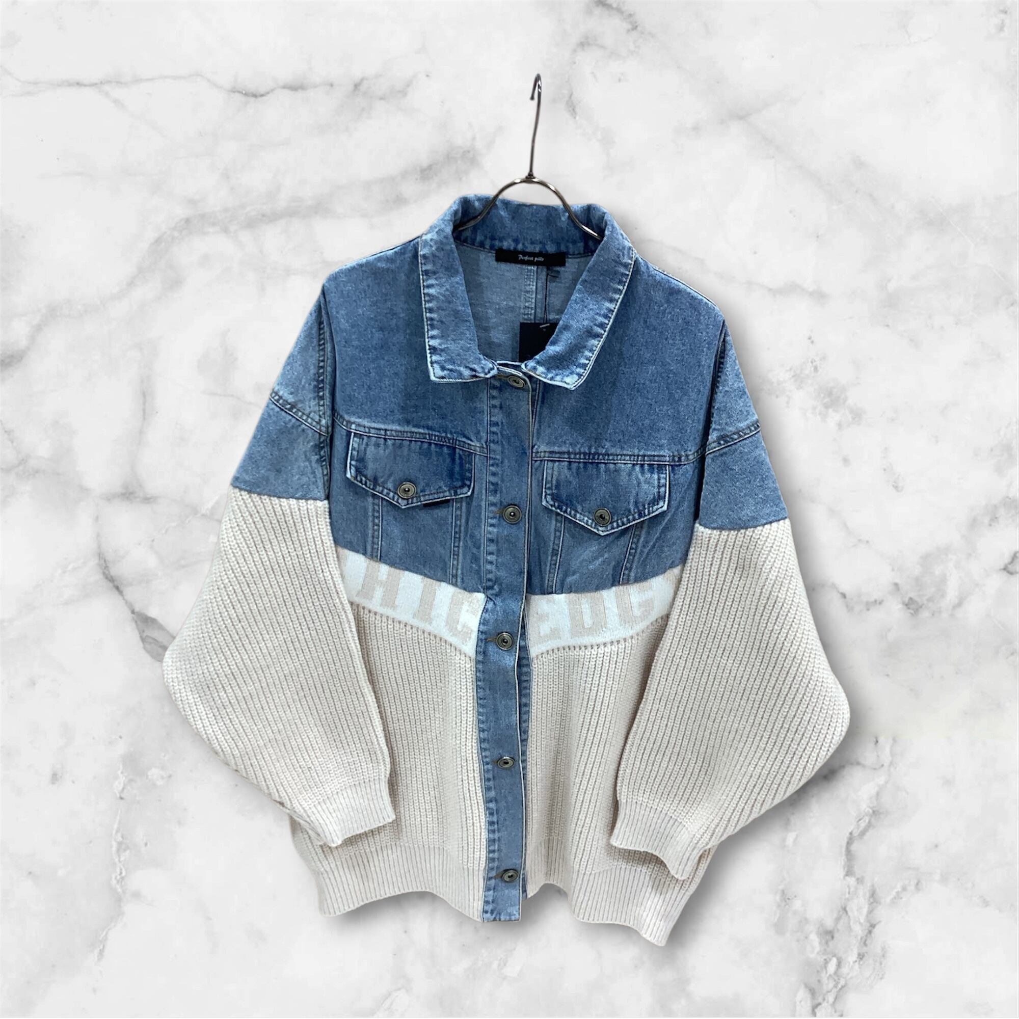 デニム素材とニットの切替が絶妙に調和したカーディガンです。柔らかなニットが着心地を高め、デニムのカジュアルさと相まって、コーディネートの幅が広がります。ロゴデザインがポイントになり、シンプルながらもおしゃれな印象を与えます。